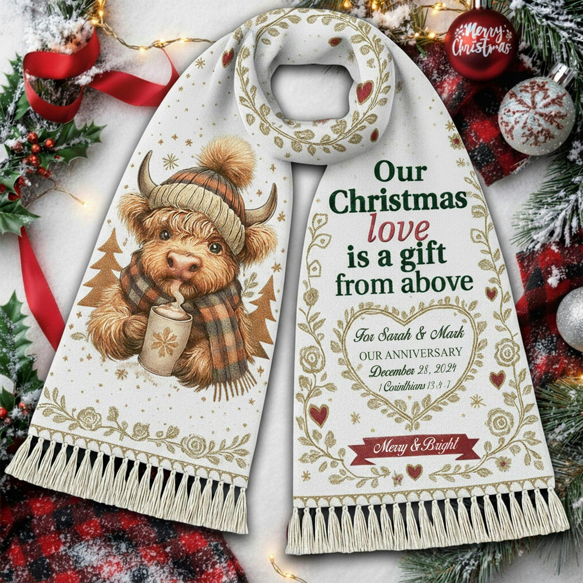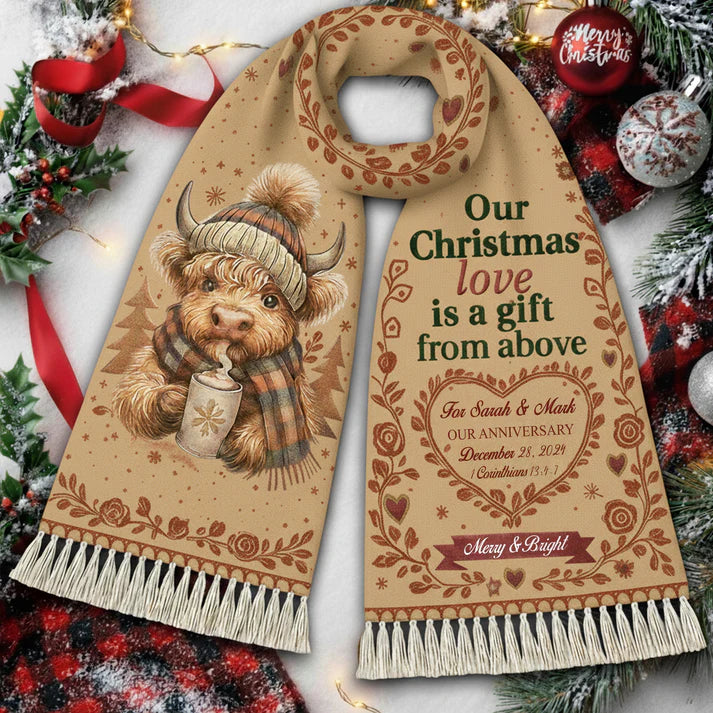 Personalized Christmas Scarf for Couple – Cute Highland Cow Christmas Gift, Cozy Winter Holiday Love Anniversary Present|SCR01
