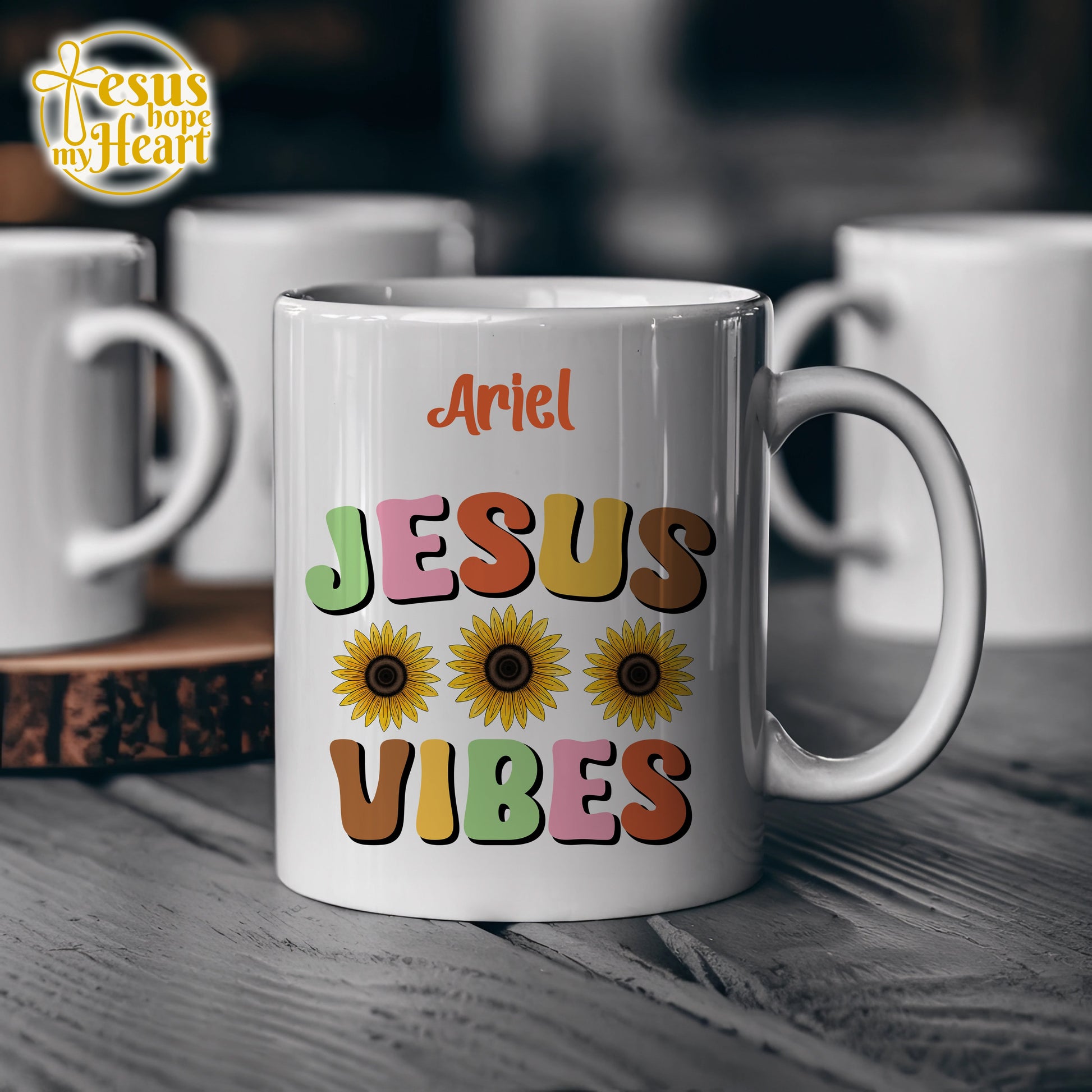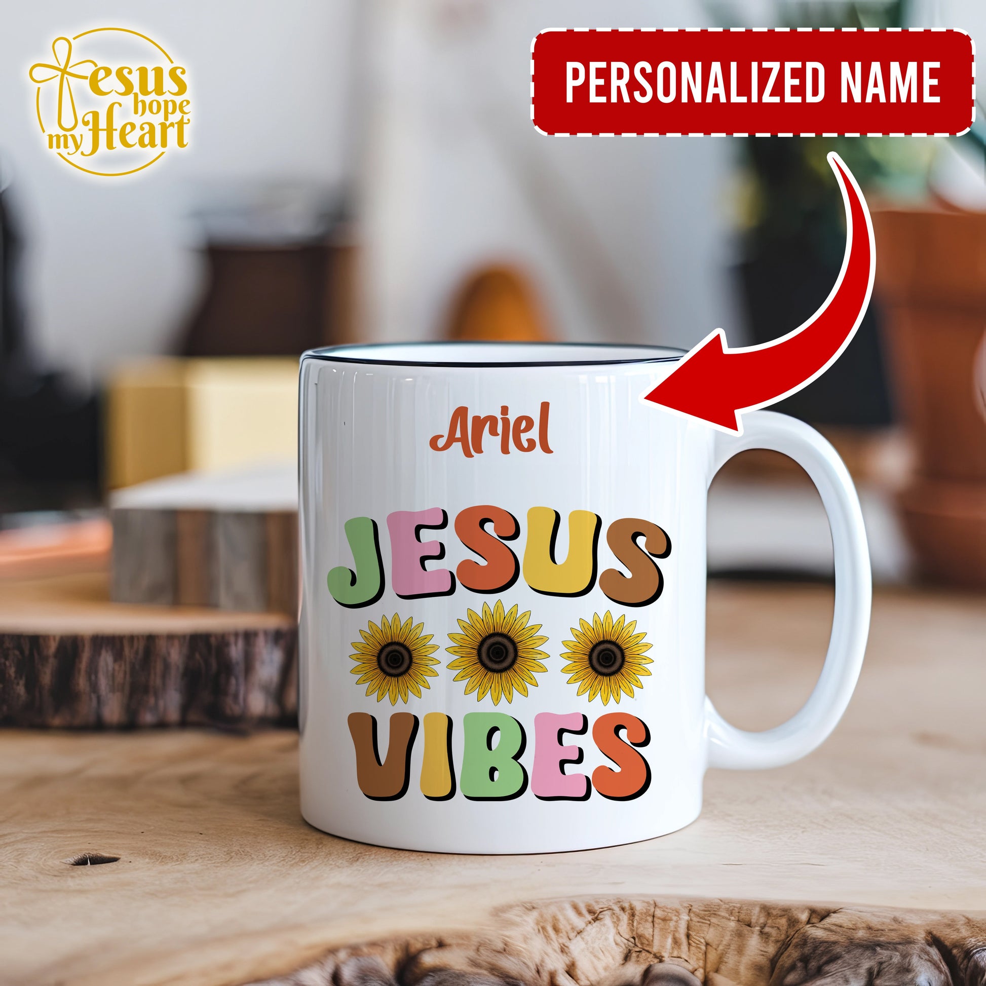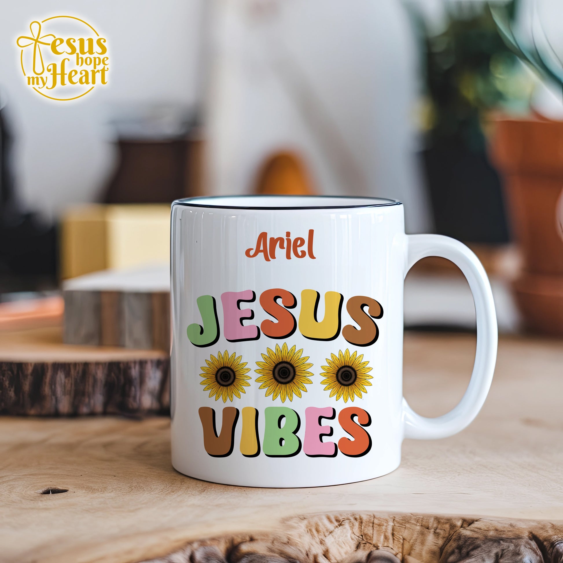 ☀️ Designed with playful lettering, three bright sunflowers, and the name of your choice, this mug is perfect for anyone who loves Jesus, color, and coffee!