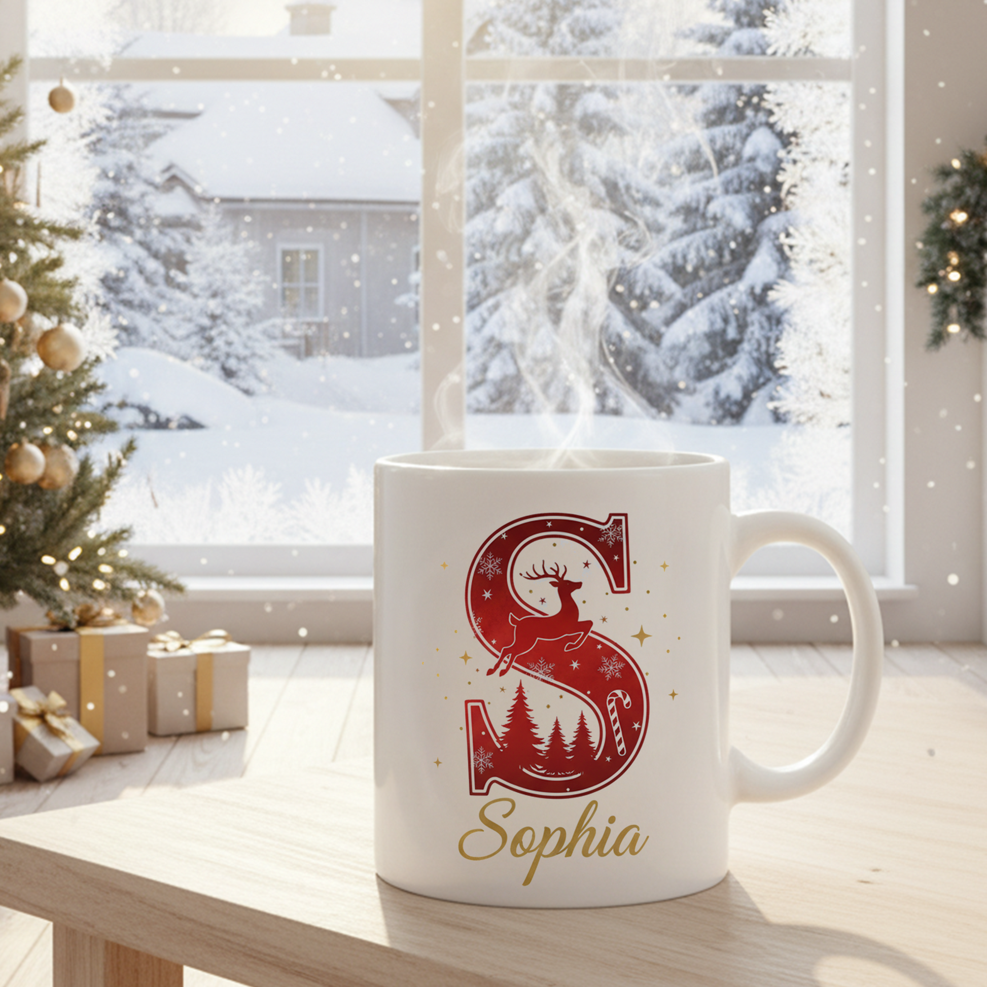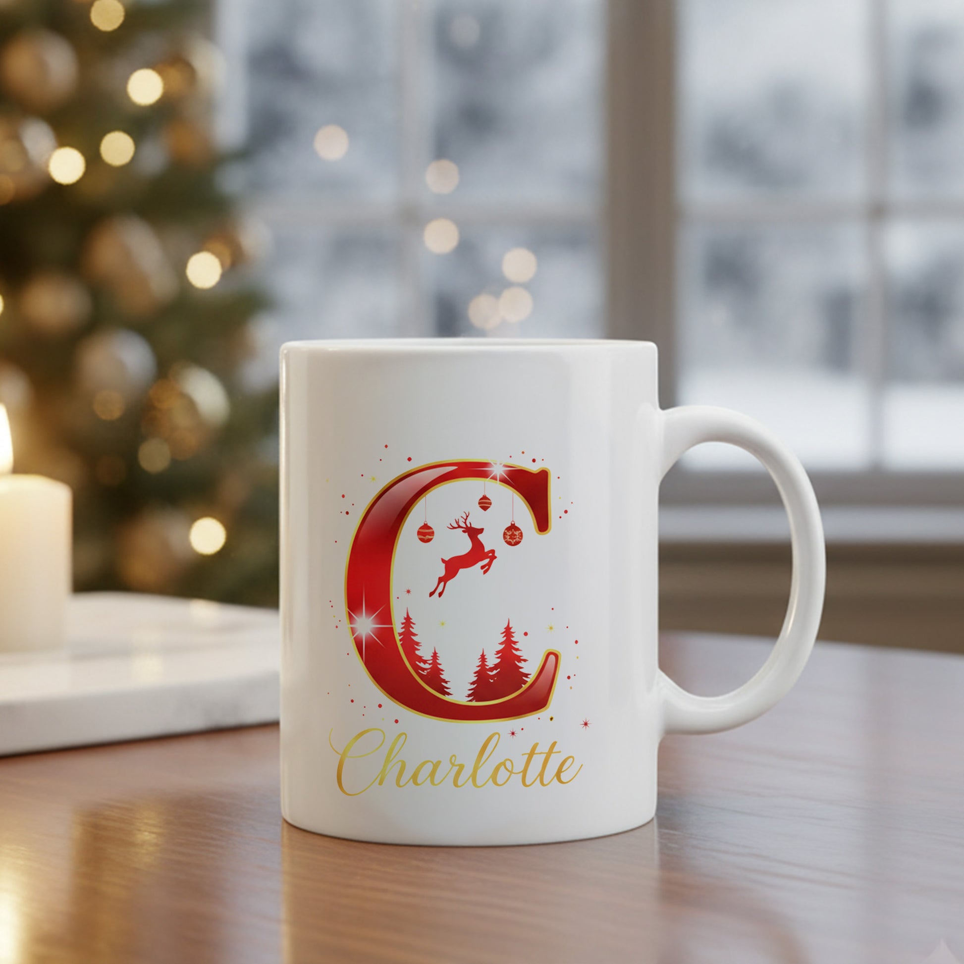 This Personalized Christmas Initial Mug features a beautifully crafted holiday letter filled with reindeer, pine trees, snowflakes, and festive gold accents — all brought to life with your custom name printed elegantly below.