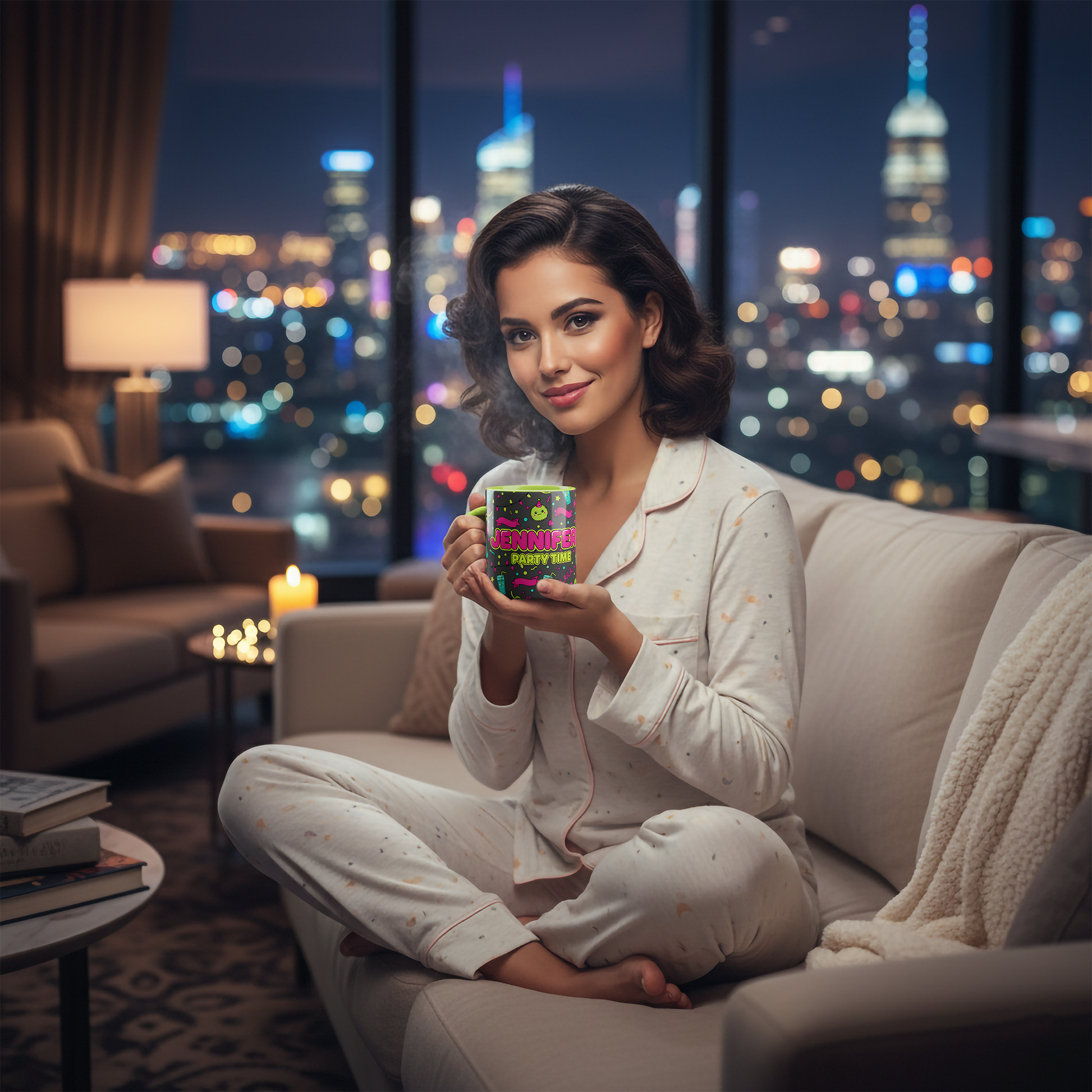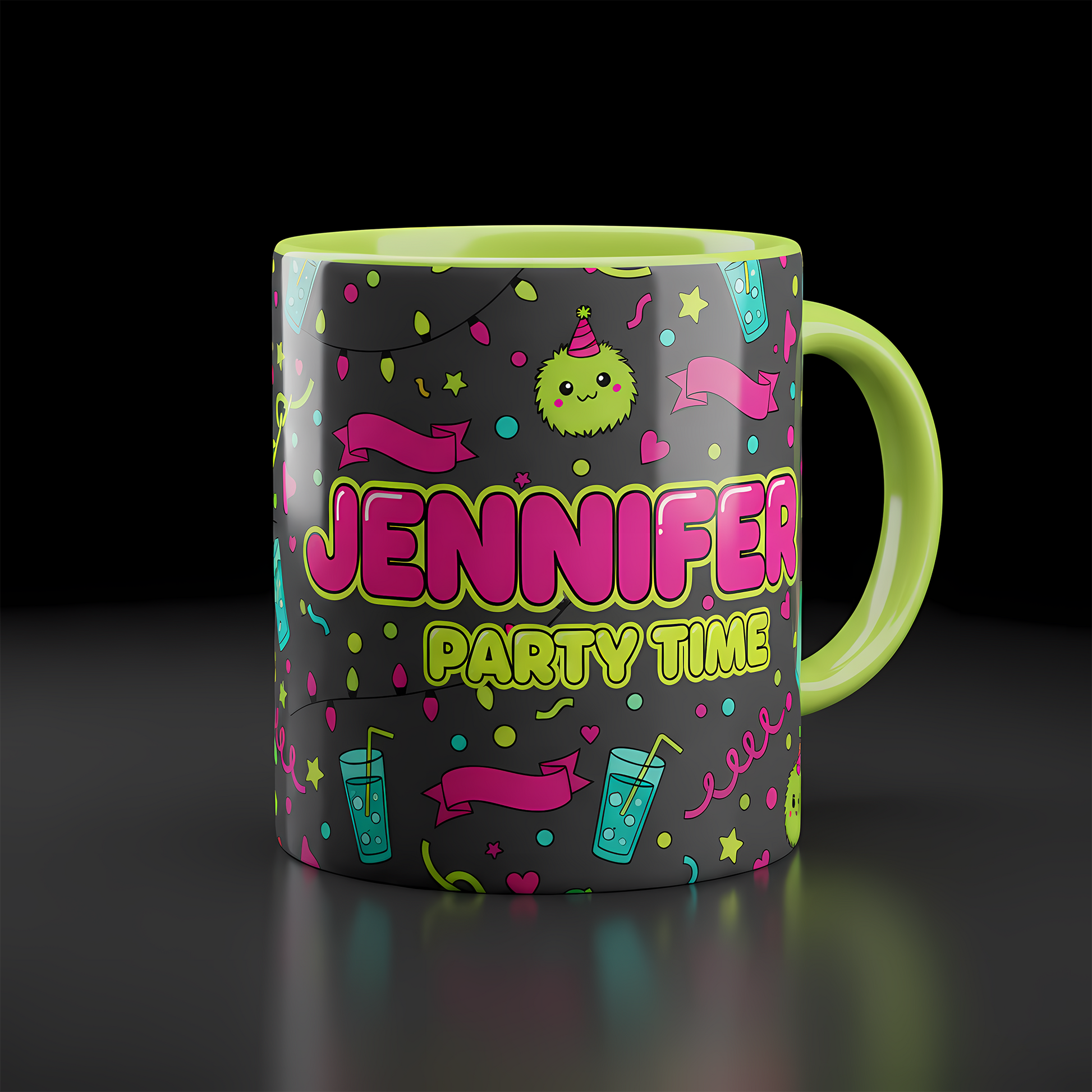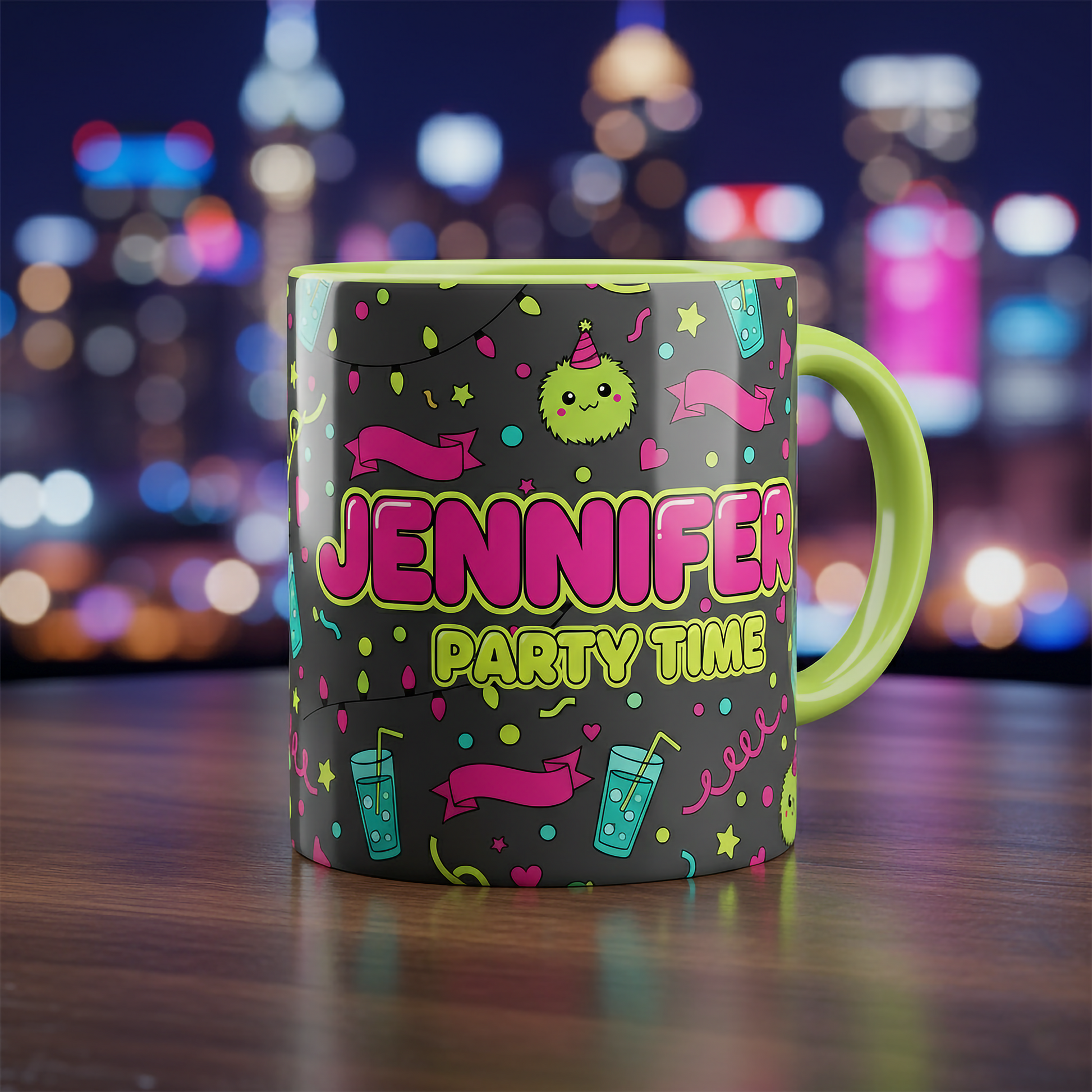 This vibrant neon āParty Timeā mug turns any drink into a celebration. With cute doodles, glowing party icons, and your custom name printed front and center, itās the perfect way to add fun energy to birthdays, girlsā nights, office desks, dorm rooms, or cozy weekend mornings.