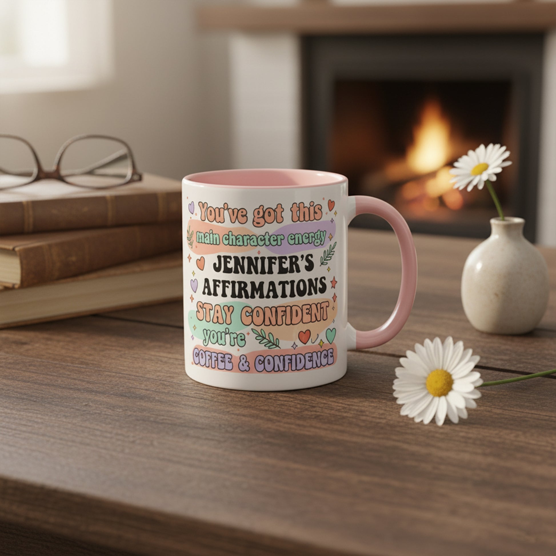 Start your day with positivity, color, and encouragement. This Personalized Affirmations Mug is designed for anyone who loves uplifting messages, pastel tones, and a daily boost of confidence. Featuring motivational phrases like “You’ve got this,” “Main character energy,” and “Stay confident,” this mug brings cheerful vibes to every sip.