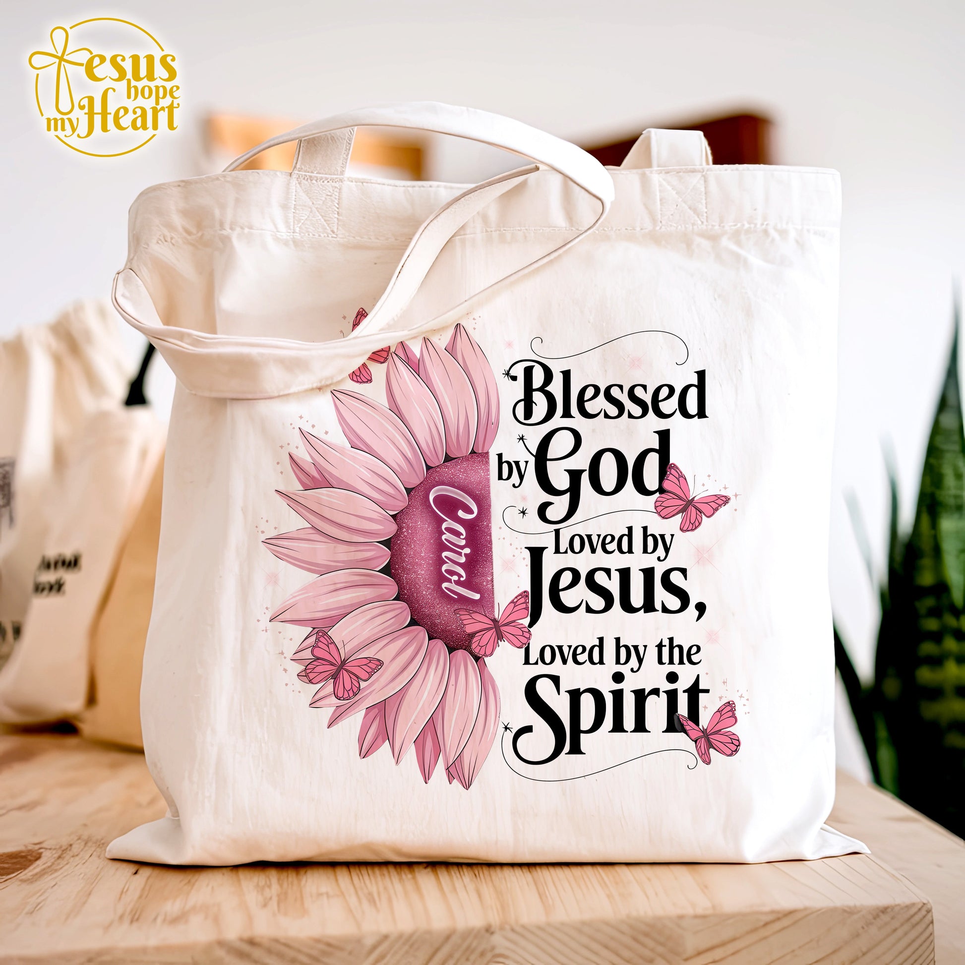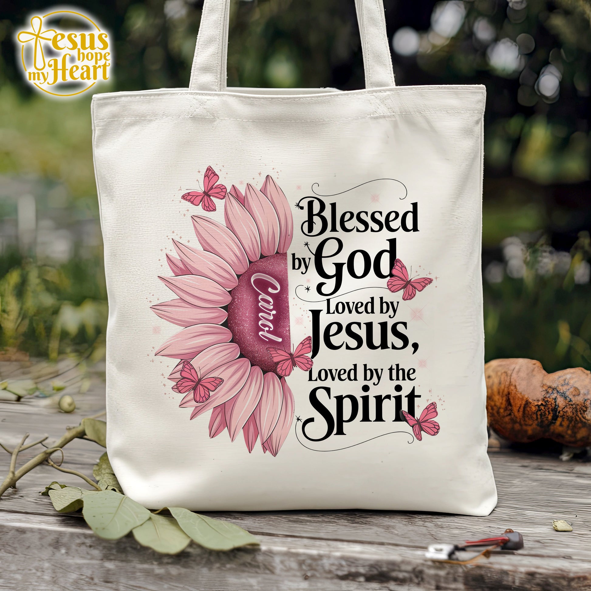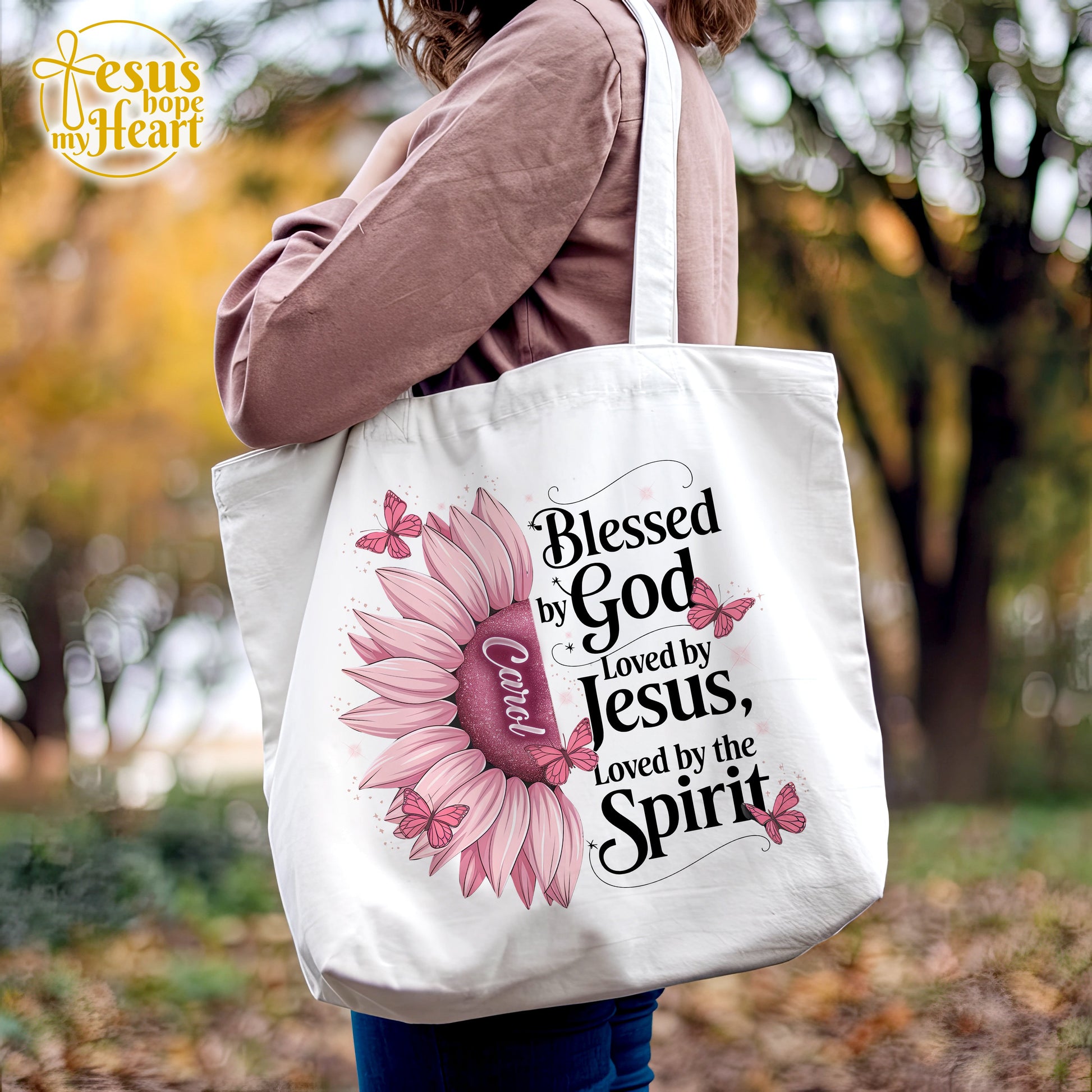 Celebrate faith, love, and identity with this beautiful "Blessed by God, Loved by Jesus, Loved by the Spirit" tote bag. The vibrant sunflower design paired with delicate butterflies and a personalized name in the center creates a touching gift for any Christian woman. Whether for church, daily errands, or gifting on special occasions, this tote is both meaningful and practical.