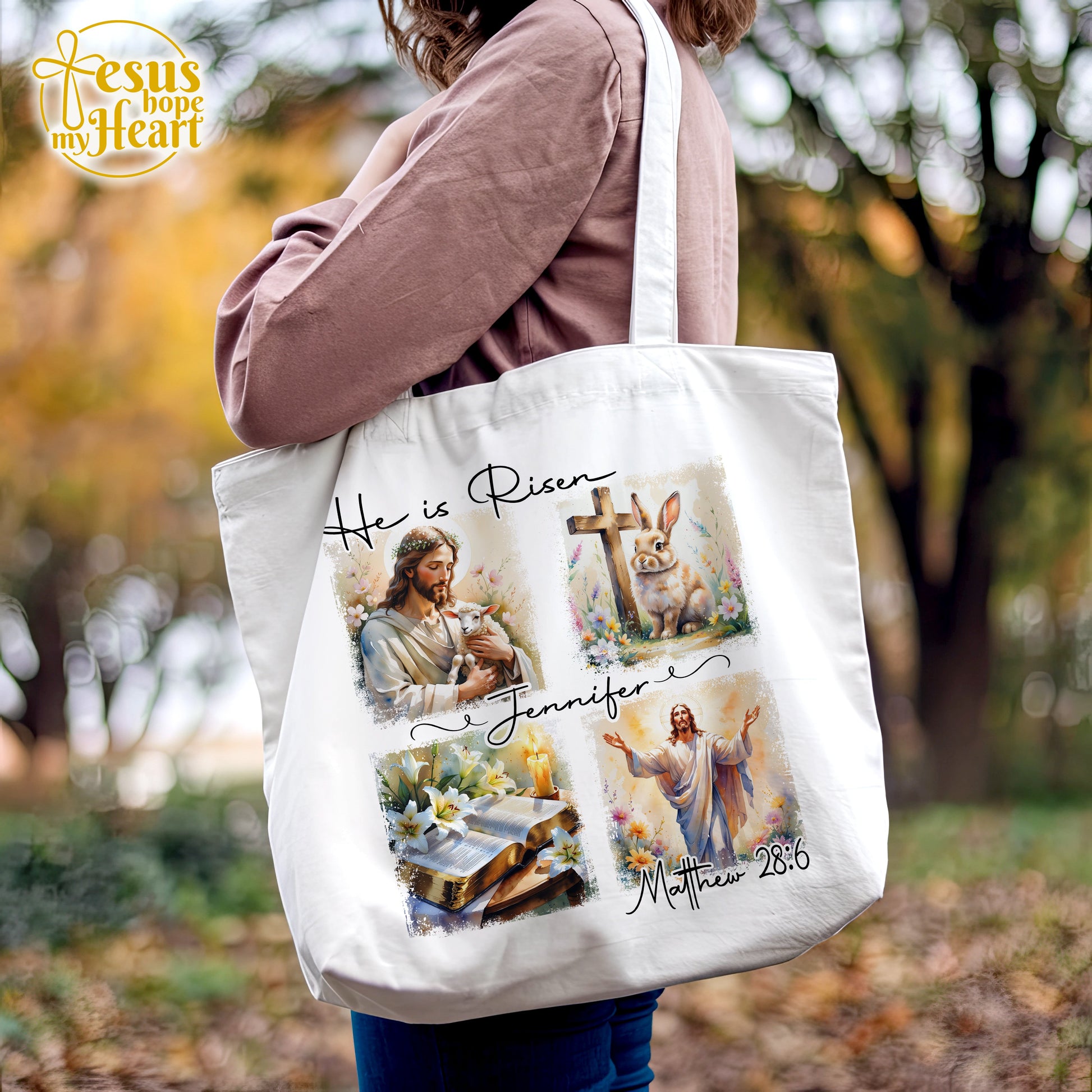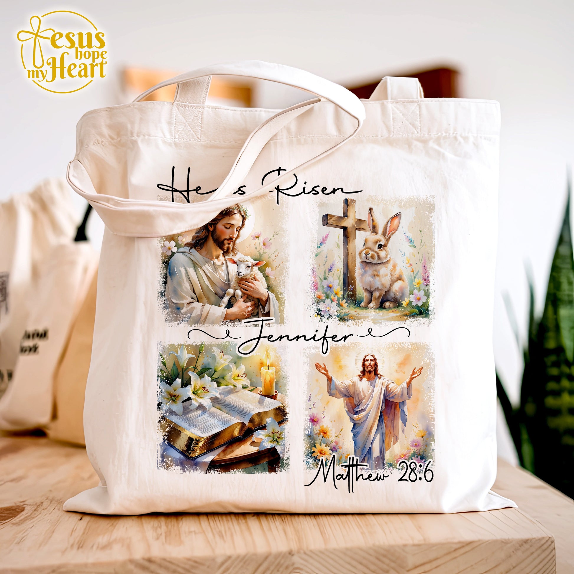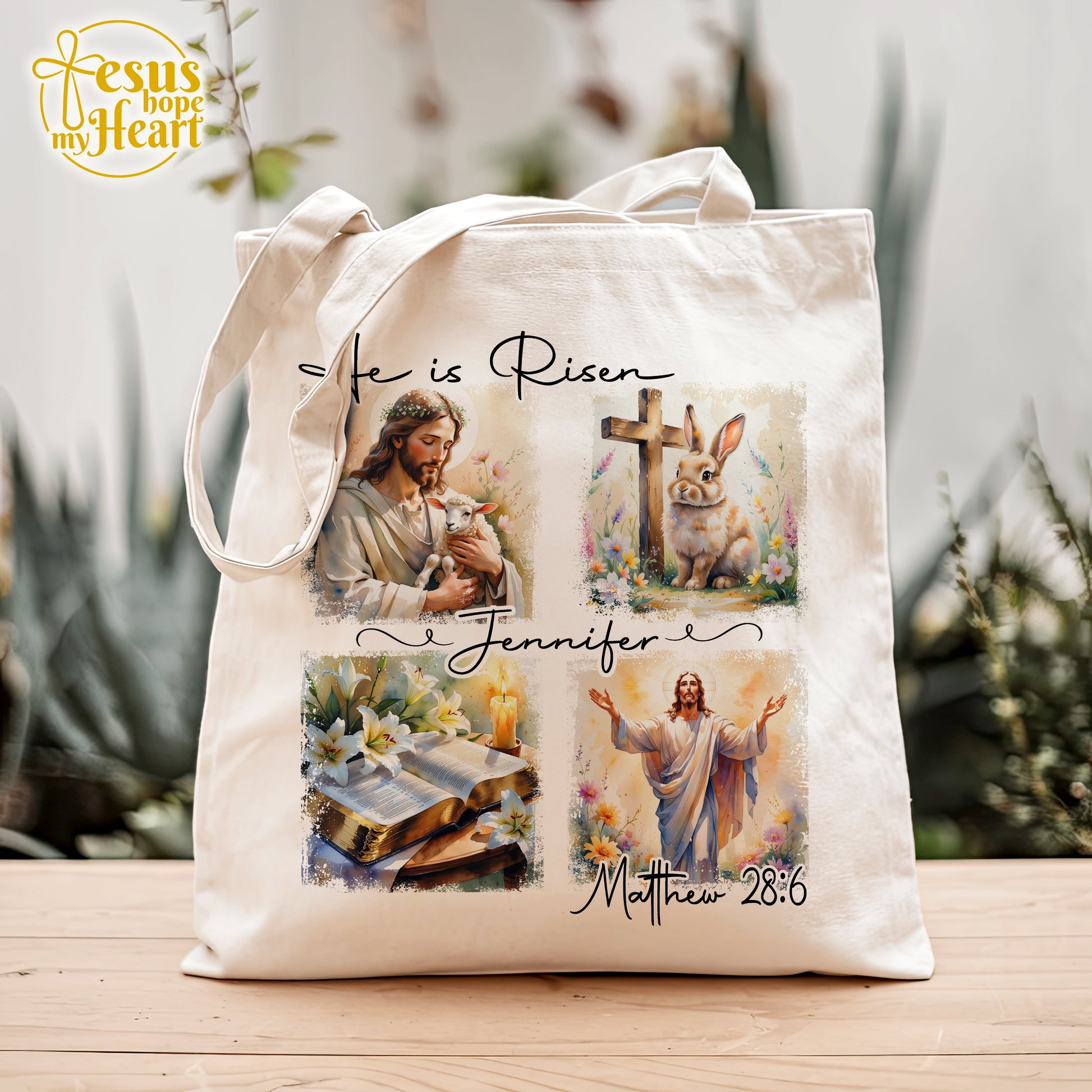 Celebrate the resurrection of Jesus with this beautifully designed "He Is Risen" tote bag, featuring inspiring Christian illustrations: Jesus with the lamb, a cross and bunny, an open Bible with lilies, and the powerful verse Matthew 28:6. Add a custom name to make it truly one-of-a-kind and meaningful!