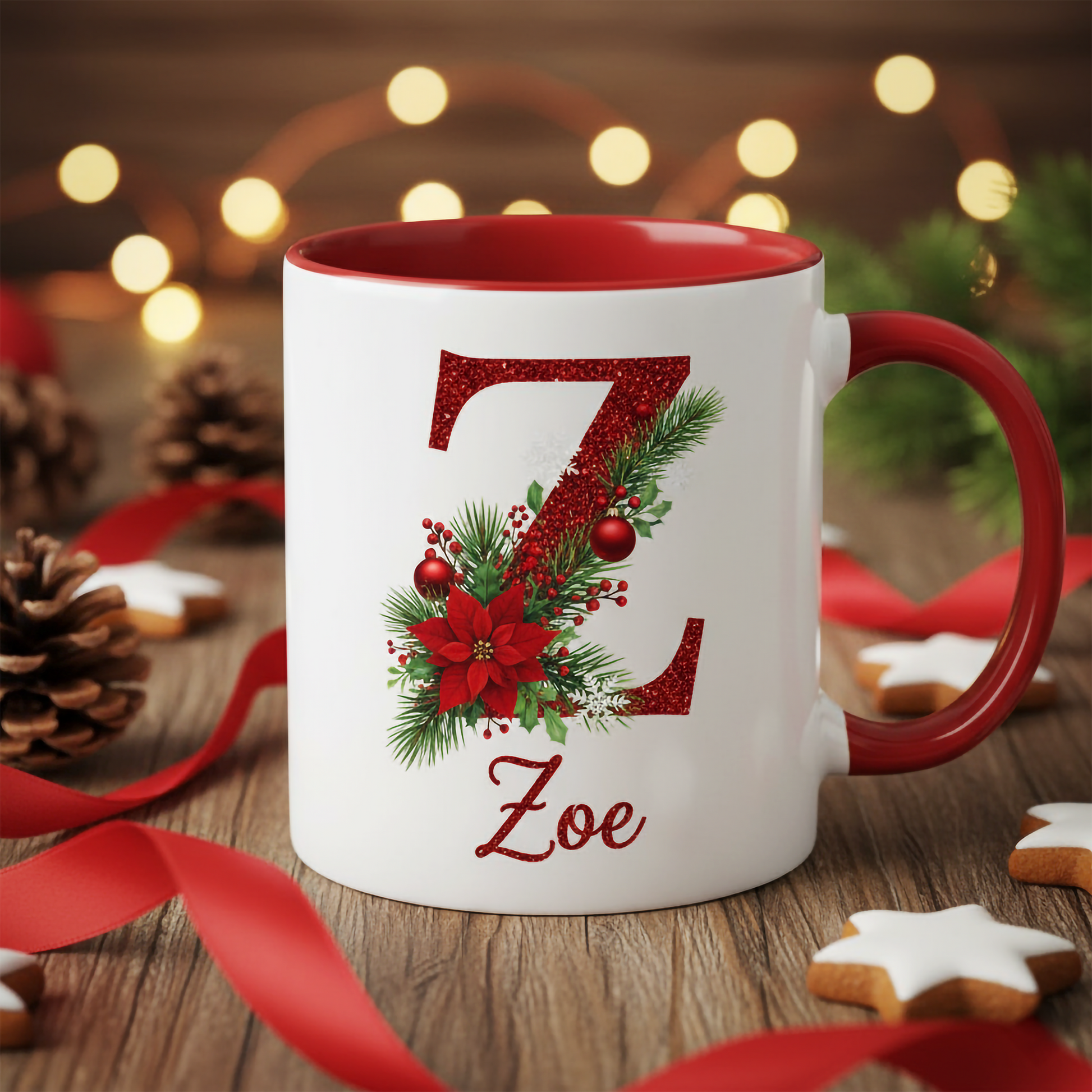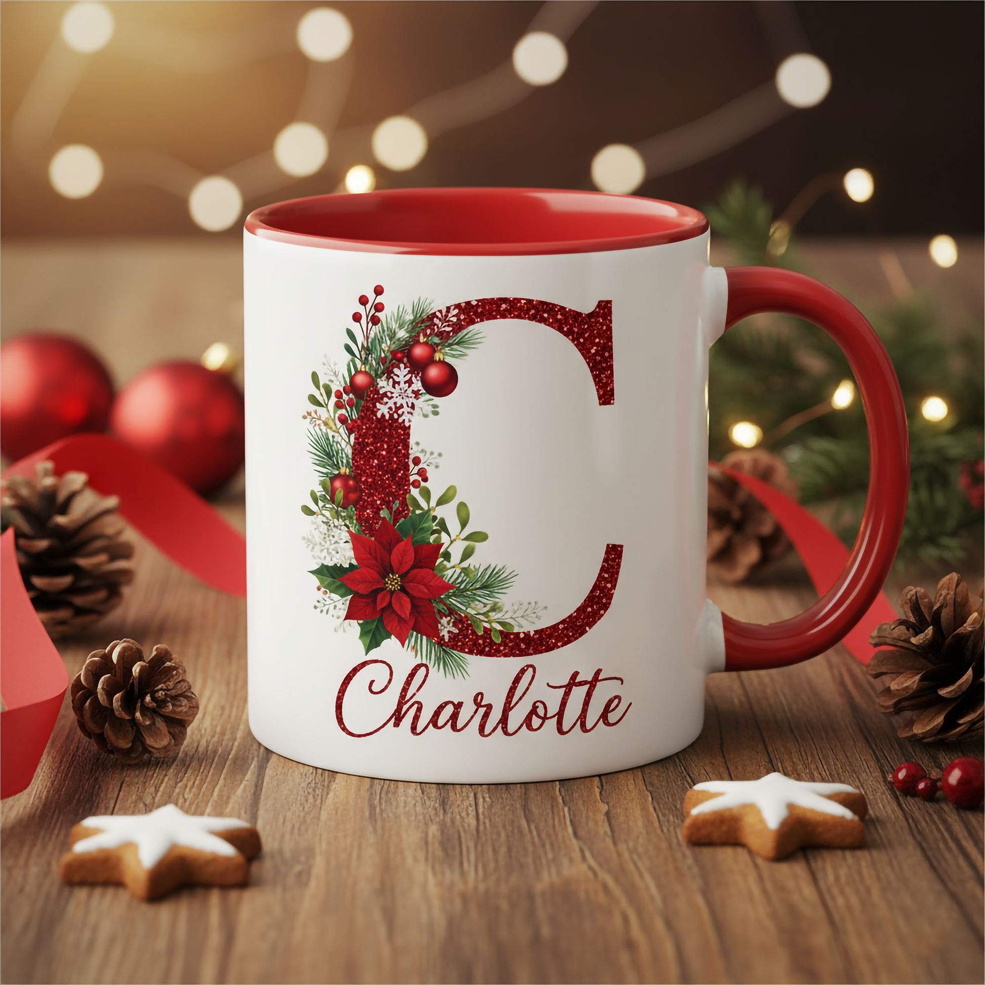 There’s something truly magical about sipping a warm holiday drink from a mug that feels personal, festive, and made just for you. This Personalized Christmas Initial Mug brings that magic to life with a beautiful glitter-style letter design, holiday foliage, and your custom name — creating a cozy, heartwarming gift that delights at first glance.