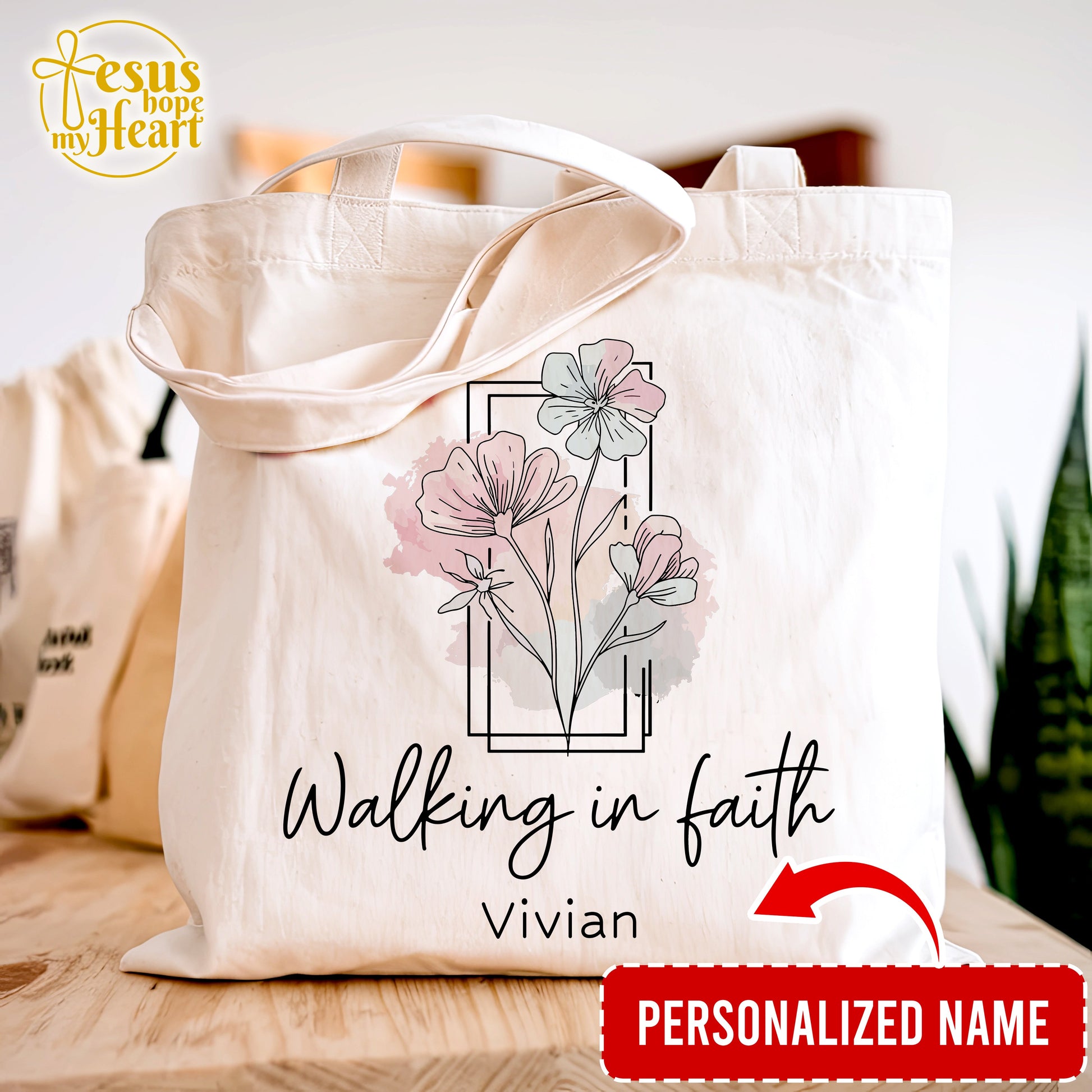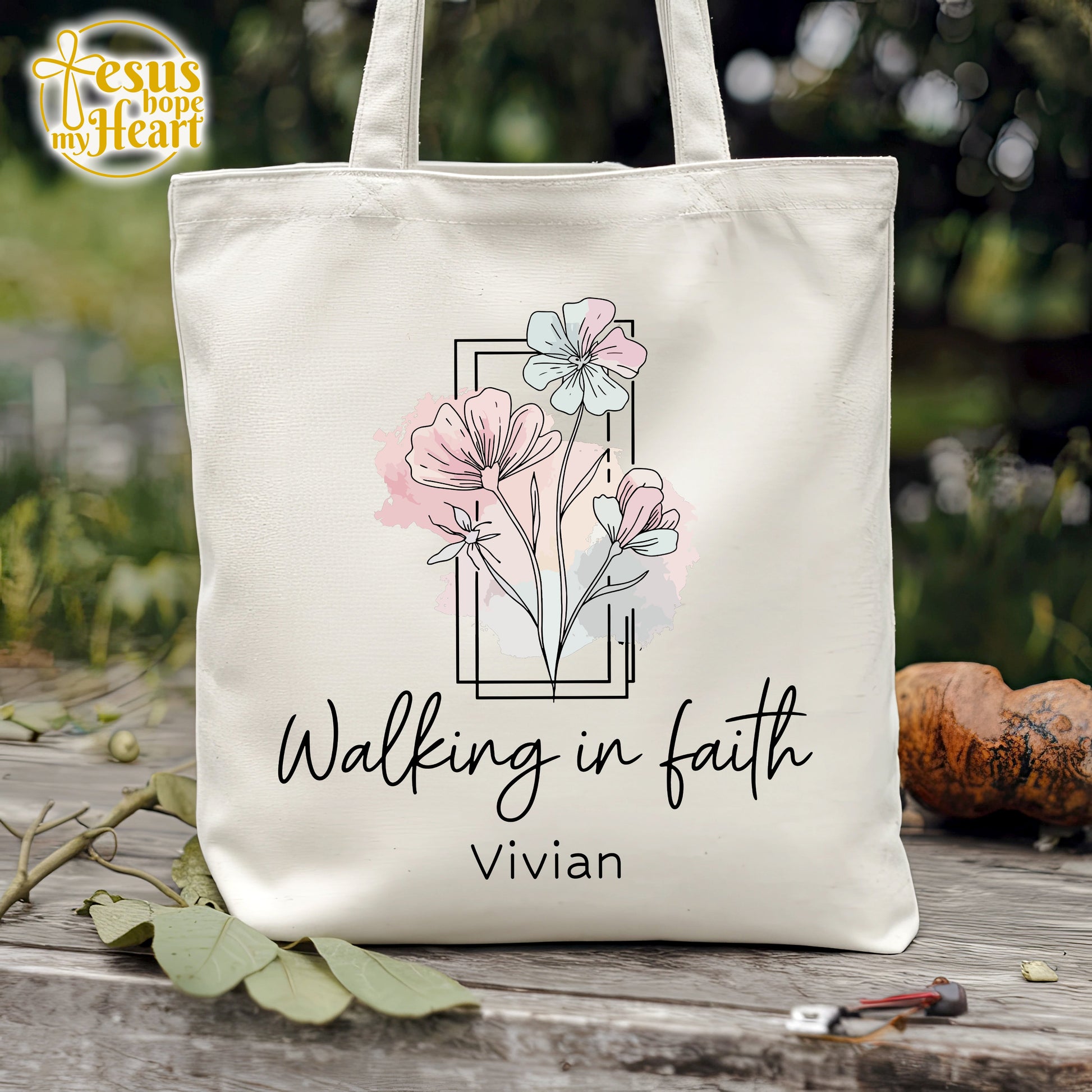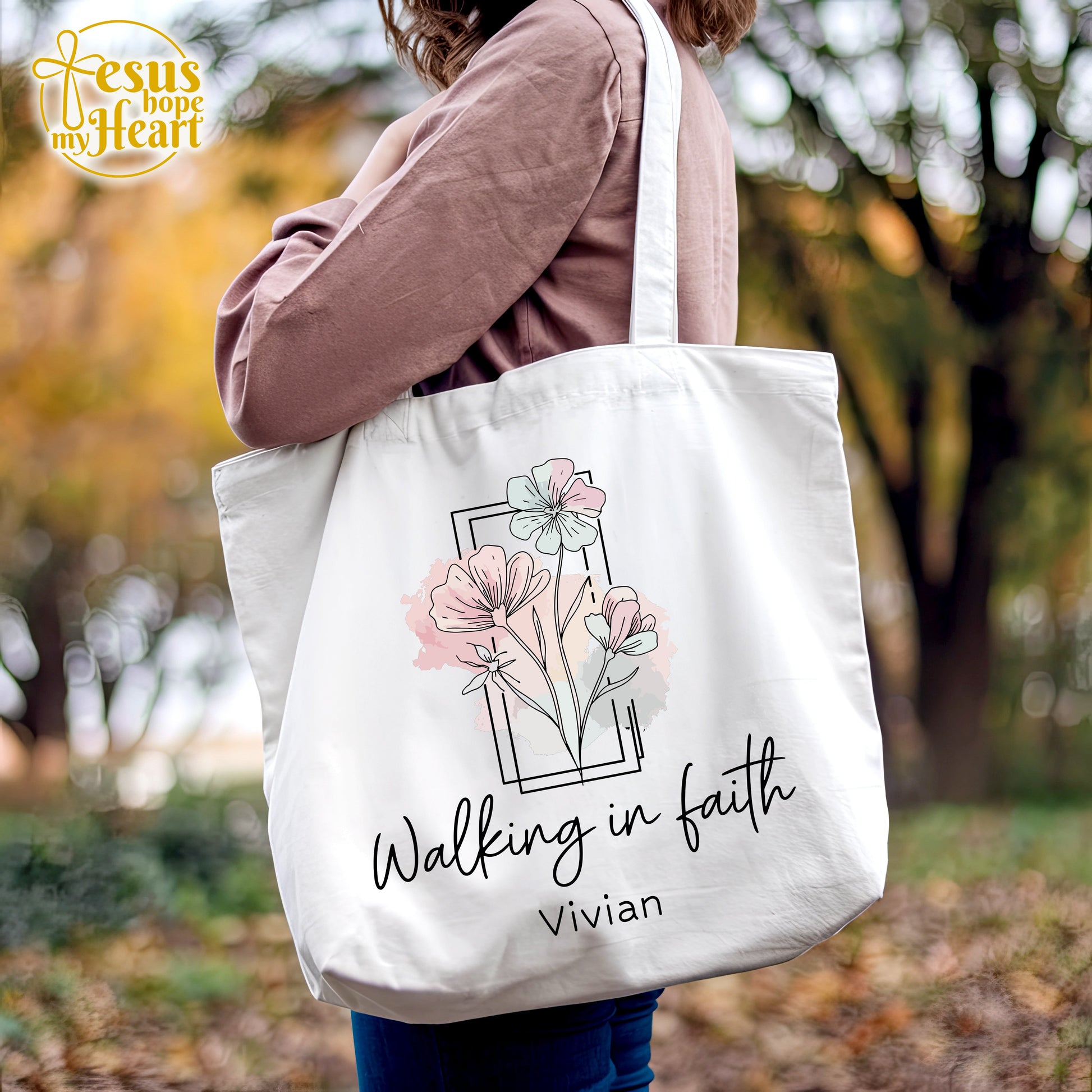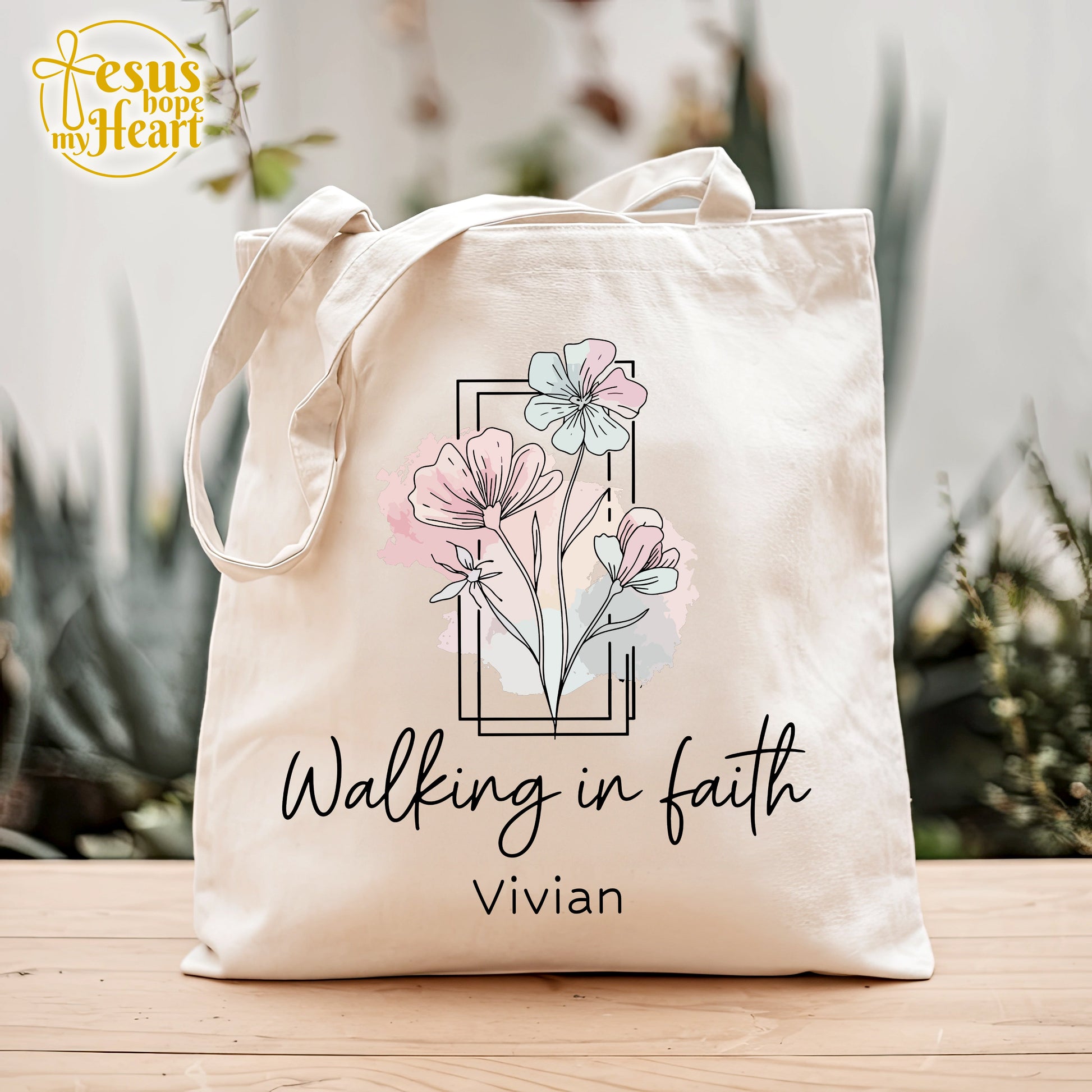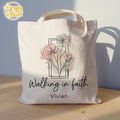 Custom Walking in Faith Tote Bag, Christian Floral Tote, Faith Gift for Her, scripture tote bags, bible verse tote, gifts for women of faith