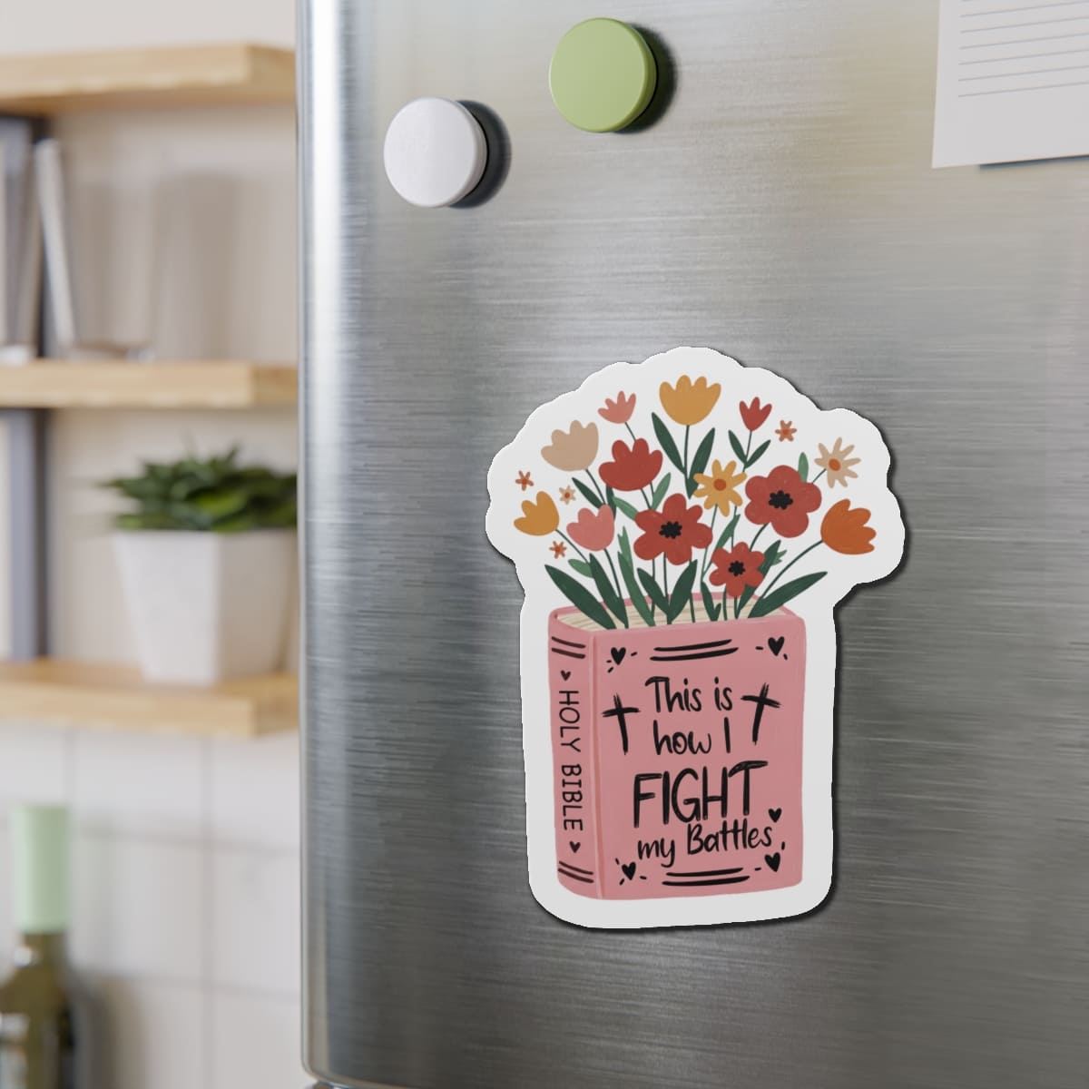 Bring your faith to life with this inspiring Christian sticker, featuring the empowering quote “This is how I fight my battles” displayed on a Holy Bible surrounded by blooming flowers. A beautiful reminder that true strength comes from Scripture and prayer.